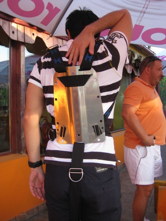 - backplate: - e mai lucios decat cel DSS, are un H desenat; tabla mi s-a parut un pic mai subtire; nu are sisteme de protectie/blocare a harnasamentului; wing-urile de single tank nu se prind ca la DSS direct prin benzile de fixare ale buteliei, ci prin insurubarea intre backplate si un single tank adapter; de aici apar dupa parerea mea urmatoarele dezavantaje: muncesti dupa fiecare dive la insurubat/desurubat, STA-ul metalic ar putea zgaria cam usor butelia, butelia e mai departata de spatele scafandrului cu inca ~3-4 cm